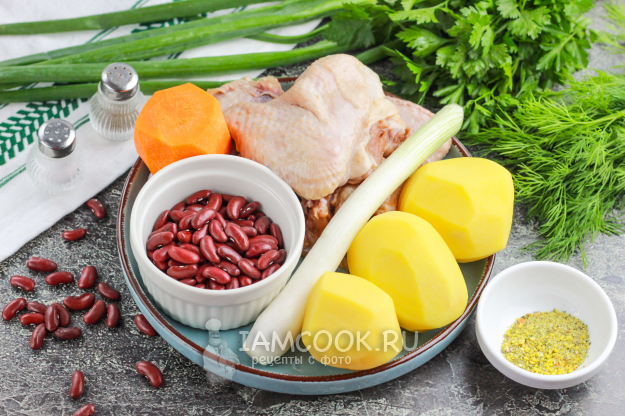 Продукты для приготовления куриного супа с красной сухой фасолью - перед вами!