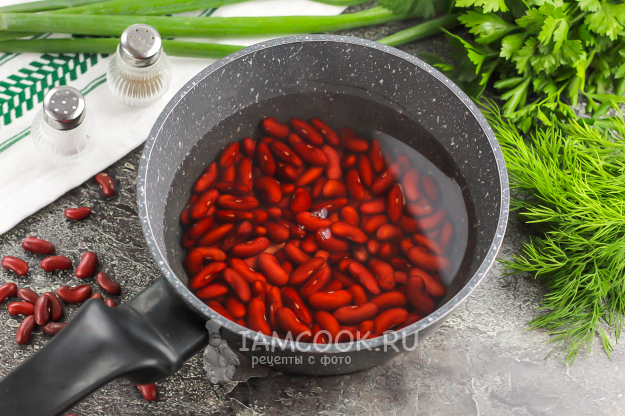 Фасоль замочите заранее, минимум за 30 минут. Можно замочить бобовые и с вечера, главное - не забыть это сделать! Многие варят фасоль с содой 5 минут - благодаря ей бобовые быстрее разбухают. С красной фасолью такой вариант не проходит - сода забирает цвет и фасоль становится бурой, неаппетитной.