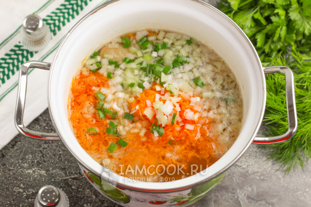 Натрите морковь на терке с мелкими ячейками, зеленый лук измельчите. Картофель нарежьте средними кубиками. Добавьте в бульон.