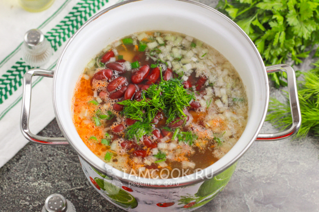 Измельчите свежую зелень и добавьте в суп вместе с лавровыми листьями. Отварите еще 10-15 минут, до мягкости фасоли и картофельной нарезки.