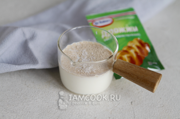 Молоко слегка прогреть, добавить в него сухие дрожжи и 1 ч.л. сахара. Все ингредиенты перемешать и оставить на столе на 15-25 минут.