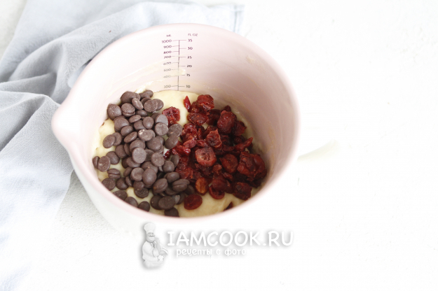 Затем добавляем вяленую клюкву и шоколад. Постарайтесь не использовать старые пряности: это касается куркумы, ванильного сахара. Шоколад и клюкву я покупала в кондитерском магазине. Продукты уже обработаны и подготовлены к выпечке. Если вы планируете покупать ту же клюкву на рынке, учтите, продукт будет обработан. Клюкву, возможно, нужно будет замочить в сиропе или коньяке, а затем хорошо просушить.