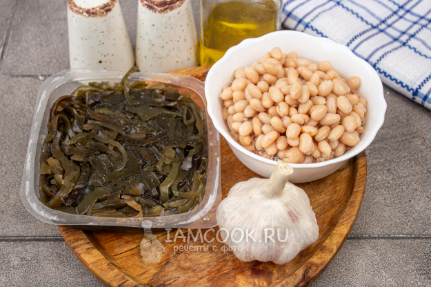 Подготовьте все необходимые продукты для паштета из морской капусты и фасоли. Фасоль я использовала белую, сахарную, консервированную - она, я считаю, лучше всего подходит для этого блюда. Морскую капусту я взяла классическую, без добавок.