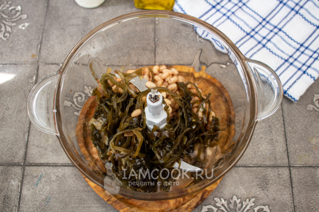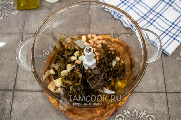 Тщательно слейте жидкость с фасоли и морской капусты. Капусту немного отожмите. Сложите фасоль и капусту в чашу блендера.