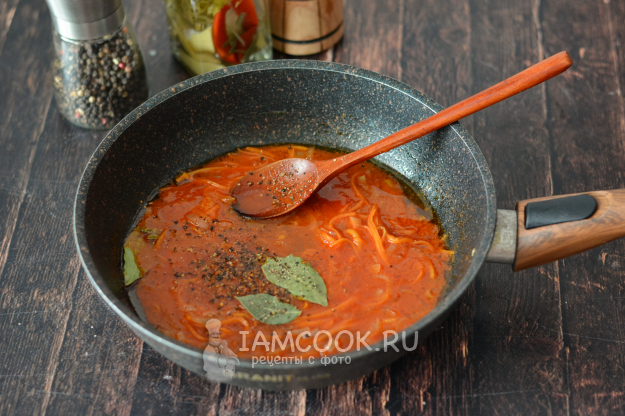 Разведите томатную пасту водой, добавьте соль, уксус и щедро поперчите из мельницы. Проварите на среднем огне маринад около 10 минут, чтобы овощи приготовились, но остались слегка хрустящими.