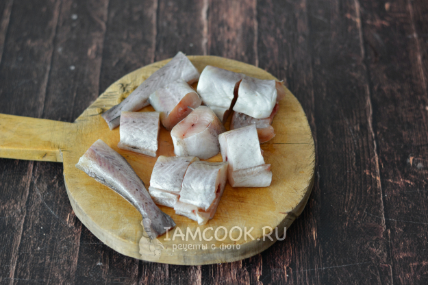 Минтая очистите от внутренностей, срежьте плавники, обязательно удалите черную пленку внутри брюшка. Сполосните тушки минтая и обсушите салфетками. Нарежьте на небольшие кусочки.