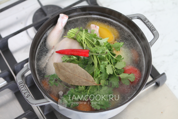 Правильная шурпа готовится на слабом огне. Тогда у вас точно получится прозрачный бульон. Курицу достать, разделать. Лук, перец чили, помидоры и кинзу достать из казана - их можно выбросить.