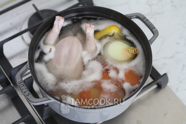 После закипания на поверхности воды появится пена, которую нужно будет собрать ложкой или ситечком.