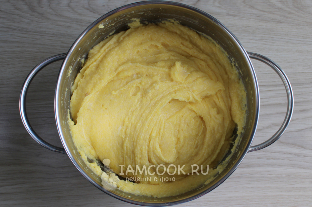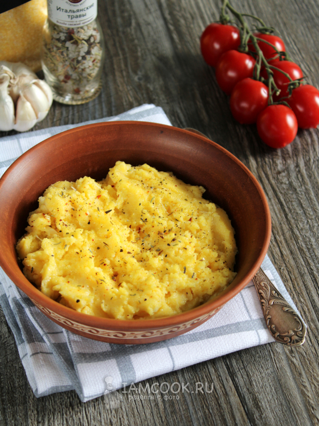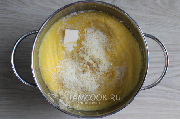 В готовую горячую поленту отправьте сливочное масло, тёртый пармезан, чесночную массу и прованские травы.