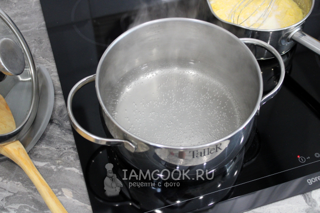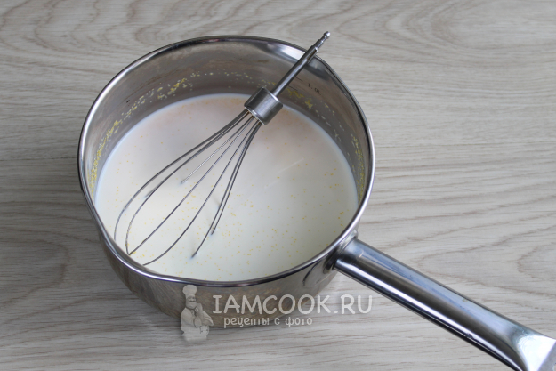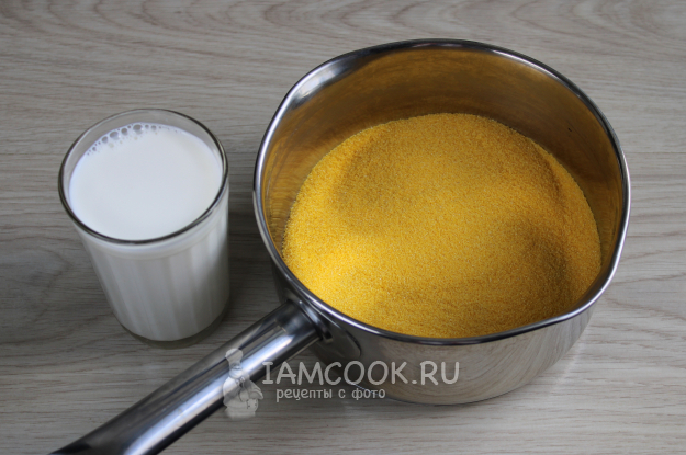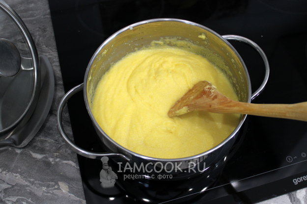 Когда вода в кастрюле начнет закипать, влейте в неё при помешивании молоко с полентой.