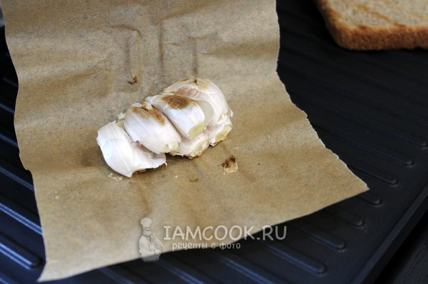 Половину или целую головку чеснока очистите от наружной шелухи, срежьте верхушку на 5 мм, чтобы обнажились зубчики. Чеснок для блюда понадобится запеченный. Его можно подготовить несколькими способами: