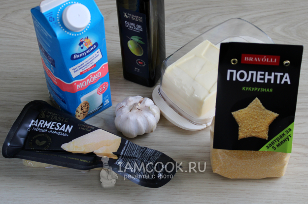 Для варианта приготовления сырной поленты по рецепту Джейми Оливера соберите ингредиенты по списку к рецепту. Использую кукурузную крупу - поленту тонкого помола, время варки которой - 5 минут, а подходит любая, только время варки уже может быть и 15 минут, и 40... Соль предложите при подаче. Полента будет содержать сыр, который может придать ей достаточно солёности.