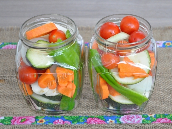 Этот рецепт использую много лет, а когда выезжаем на зимнее барбекью, то это к мясу да под напиток горячительный самое оно! Такие симпатичные баночки прекрасный сувенир к любому застолью. Здесь присутствует весьма простой набор овощей который может меняться по Вашему желанию. В эти баночки по просьбам семейства я добавила полу острый перец, а обычно добавляю болгарский. Получилось вкусно и горячо, как раз для любителей остренького.