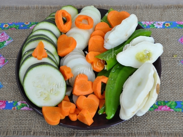 Овощи моем тщательно и нарезаем кружочками, а можно и поинтереснее, у каждой хозяйки есть формочки для печенья и не стоит забывать про них.