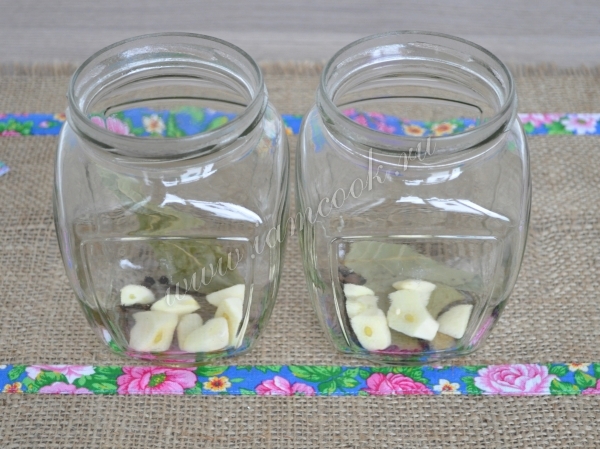 Возьмём баночки по симпатичнее, подарок же! Простерилизуем в духовке. На дно положим специи и чеснок.