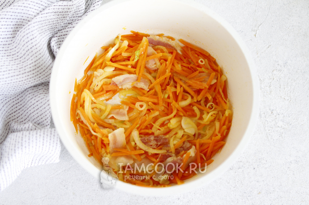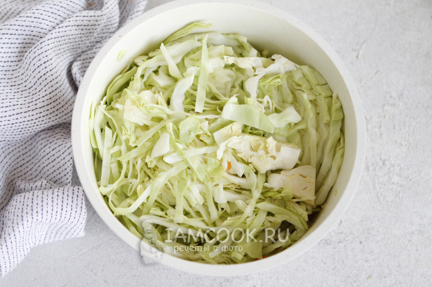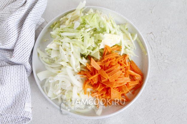 С капусты снять верхний листочек, удалить кочерыжку и нашинковать ее соломкой. Лук нарезать полукольцами, а морковь можно натереть на терке для корейской моркови.