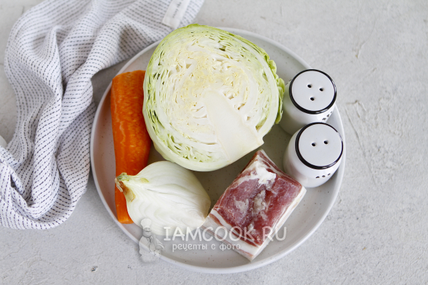 Соберем все необходимые ингредиенты для приготовления тушеной капусты с салом на сковороде.