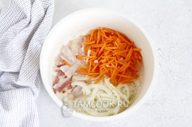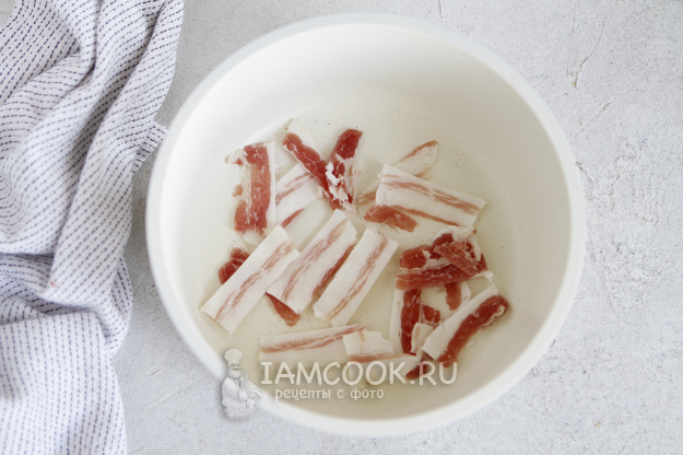 Сковороду хорошо разогреваем. Сало нарезаем на небольшие брусочки и отправляем на раскаленную сковороду. Вытапливаем из него жир. Сало можно использовать любое, с прослойкой или копченое.