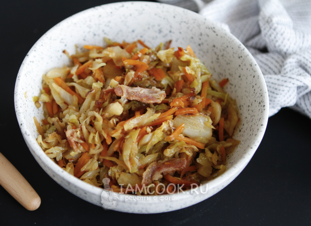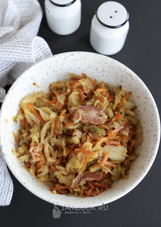 Тушеная капуста с салом готова. Подавать блюдо можно самостоятельно или как дополнение к блюдам из мяса.