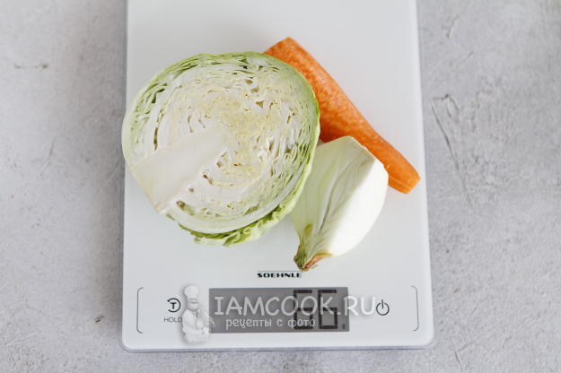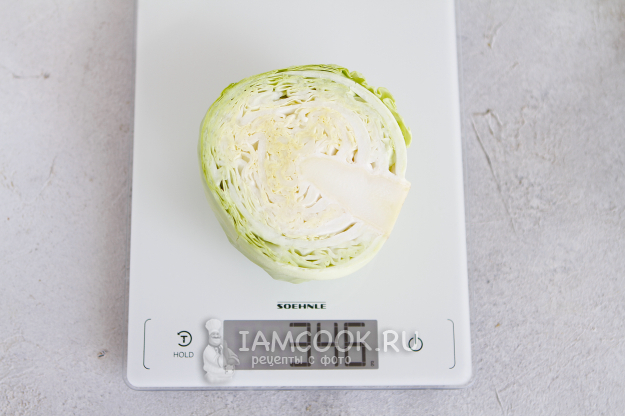 Как видите, набор ингредиентов в рецепте минимальный, а вот количество будет зависеть исключительно от вас. У меня дома был небольшой кочан свежей белокочанной капусты. Из одной части я готовила борщ, а вторую половину я потушила. Вот, к примеру, вес капусты.