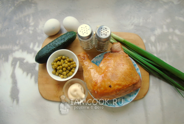 Соберите ингредиенты для приготовления салата с копченой курицей и зеленым горошком.