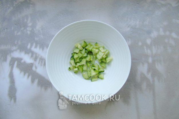 Свежий огурец помойте, очистите и нарежьте произвольно. Если шкурка у него не жесткая, то можно не чистить.