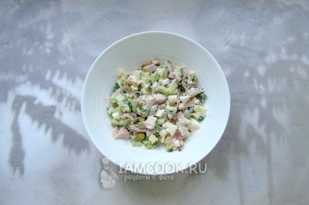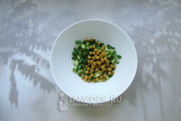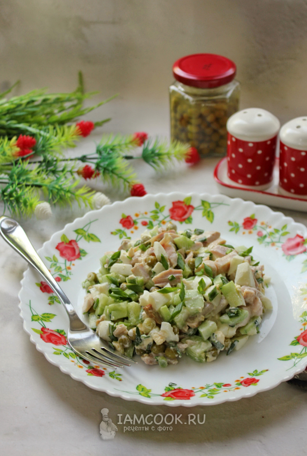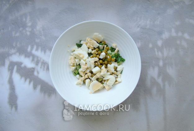 Салат с копченой курицей и зеленым горошком готов.