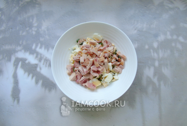 Копченую курицу нарежьте и добавьте в салат.