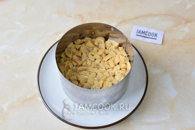 Из банки с маринованными грибами слейте жидкость. Сами грибы мелко нарежьте и выложите следующим слоем.