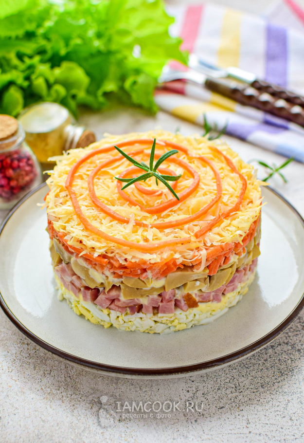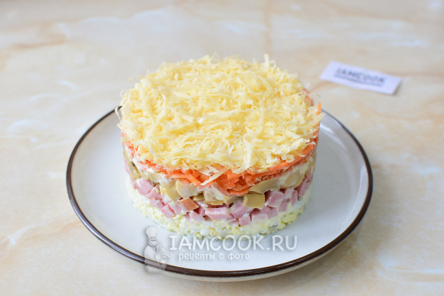 Последним слоем будет тертый сыр. Теперь аккуратно снимите с салата сервировочное кольцо и поставьте его немного охладиться в холодильник.