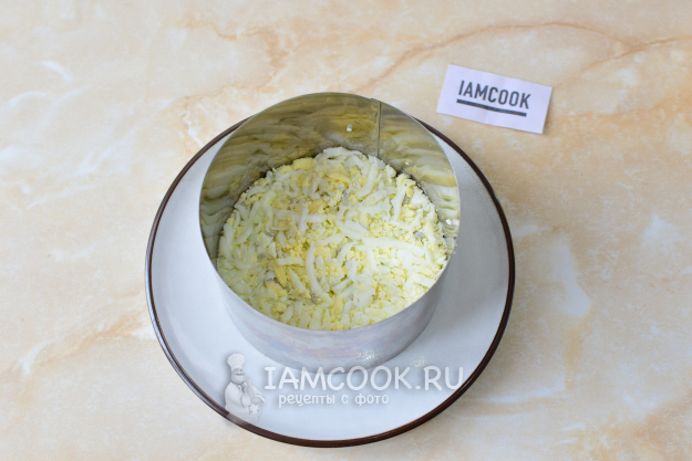Сервировочное кольцо поставьте на тарелку и выложите первым слоем тертые яйца. Немного прижмите, чтобы слой был плотнее. Этот слой и все остальные немного смазывайте майонезом.