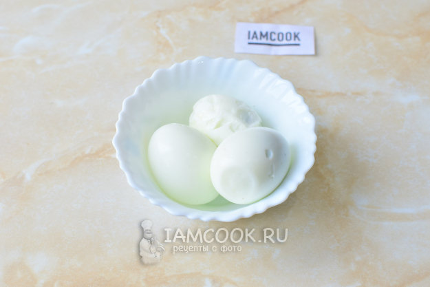 Яйца предварительно отварите в кипящей воде 7-10 минут. Затем горячую воду слейте и охладите их в холодной. Остывшие яйца очистите от скорлупы.