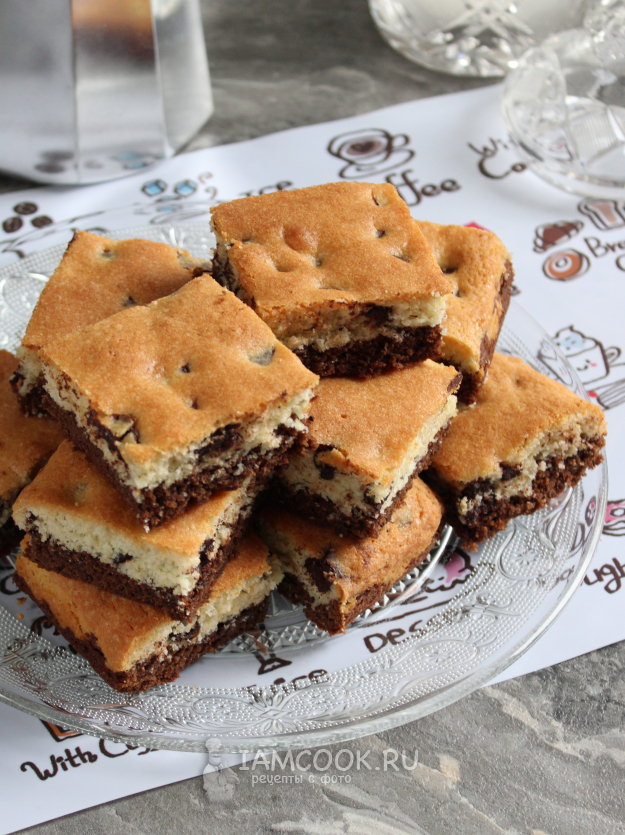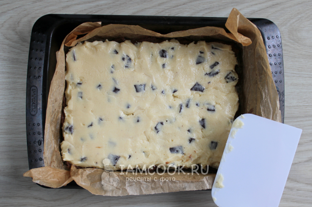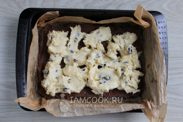 На шоколадное тесто уложите порциями песочное тесто с кусочками начинки (шоколад или другое).