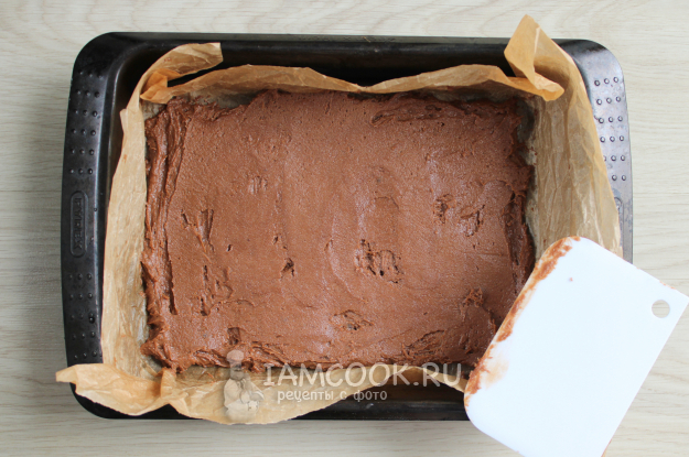 Перевалите в форму шоколадное тесто и разровняйте его сначала смоченными в воде руками, а затем кондитерским шпателем или силиконовой лопаткой.