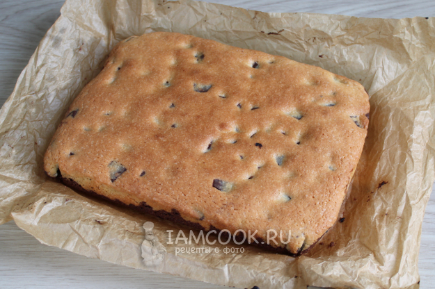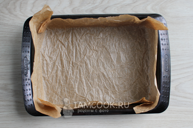 Прямоугольную форму проложите пекарской бумагой. Недавно опробовала способ, когда бумага предварительно сминается, а потом укладывается в нужную форму для выпечки. Мне понравилось! Возьмите на заметку.