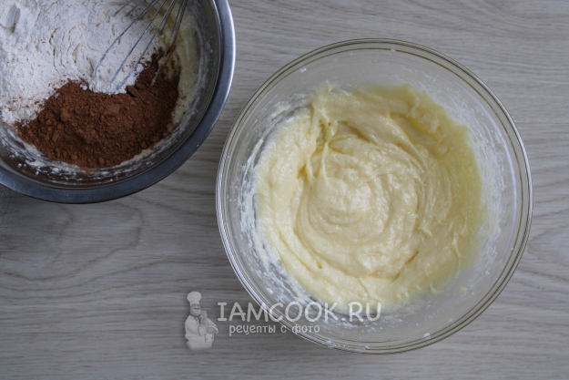 В миску с масляной массой для шоколадного теста добавьте муку, порошок какао, соль и разрыхлитель. Перемешайте до однородного состояния.
