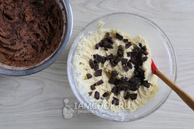 В миску с масляной массой для песочного теста добавьте муку, ванильный сахар, соль и разрыхлитель. Тоже перемешайте до однородного состояния. В полученное тесто вмешайте кусочки горького шоколада или шоколадные капли.