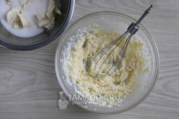 Для обоих видов теста сливочное масло нужно нарезать кубиком и дать ему размягчиться при комнатной температуре. Затем обе порции мягкого масла взбейте с сахаром.