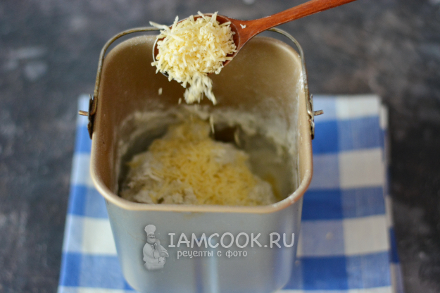 Включите хлебопечку и установите программу "Французский хлеб". Пусть начинается замес, а вы следите за консистенцией теста. Как только тесто начнёт собираться в комок, добавьте в ведёрко хлебопечки натёртый на мелкой тёрке сыр.