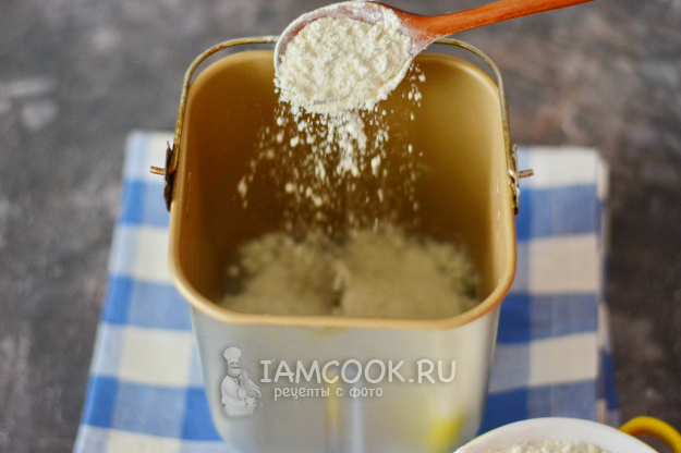 В ведерко хлебопечки влейте воду и добавьте дрожжи. После чего на жидкость насыпьте муку.