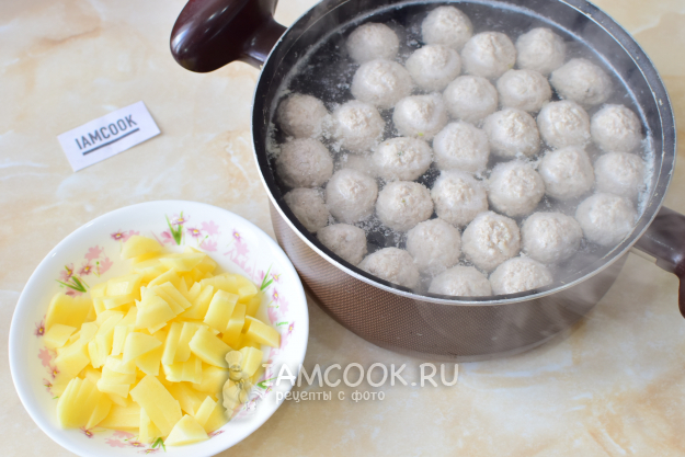 Из мясной массы скатайте небольшие шарики и опускайте их в кипящую воду. Доведите до кипения и снимите пенку. Затем добавьте в кастрюлю нарезанный картофель. Оставьте вариться минут на 10-12.