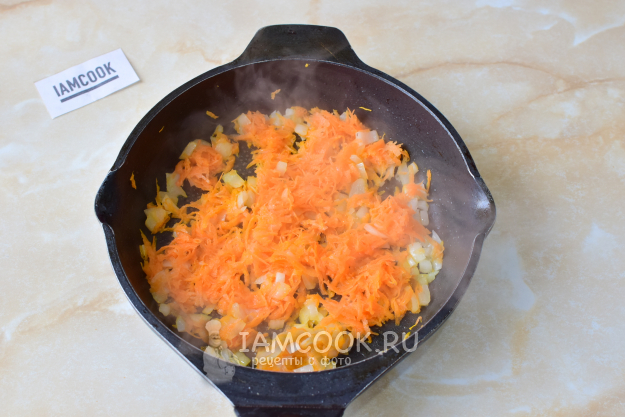 В это время очистите и измельчите морковь и лук. Обжарьте 3-4 минуты с добавлением растительного масла. Готовую зажарку отправьте в кастрюлю с супом.