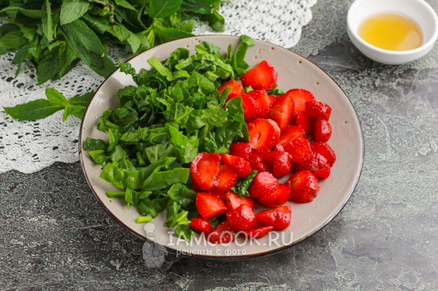 Листья шпината тщательно промойте в воде, срежьте стебли. Клубнику промойте и удалите хвостики с ягод. Разрежьте ягоды на три-четыре части, а шпинат - на ленты.