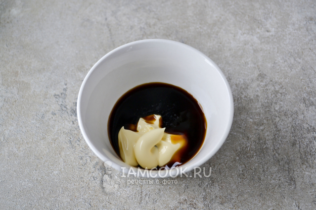 В миску положите майонез. Можно взять любой по вашему вкусу. Влейте соевый соус и устричный соус.