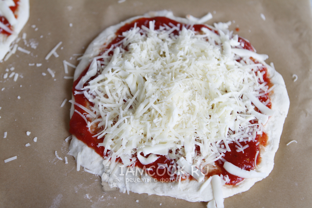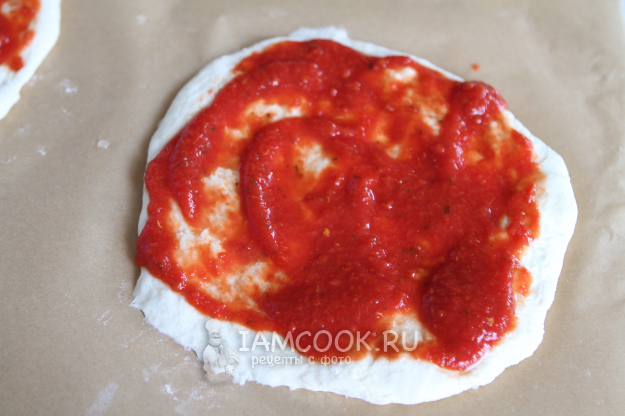 В рецепте я использовала готовый итальянский томатный соус для пиццы. Соус можно приготовить самостоятельно дома из помидоров. Если нет времени и возможности приготовить соус, то можно развести томатную пасту в теплой водичке. Главное, чтобы соус из пасты не был слишком жидким.