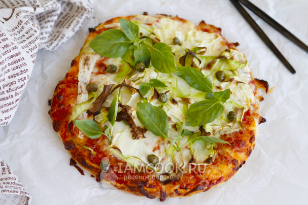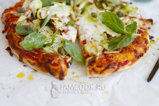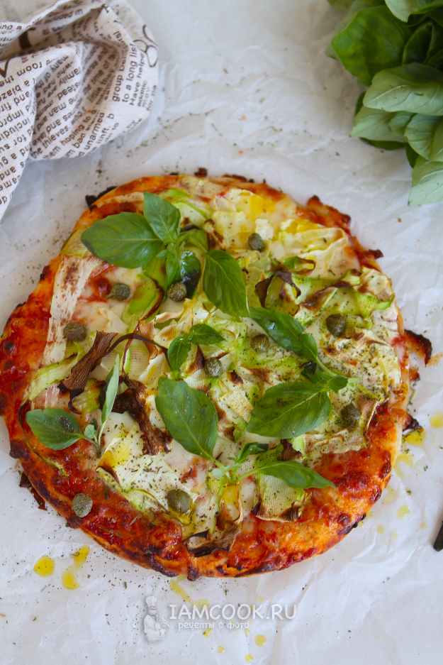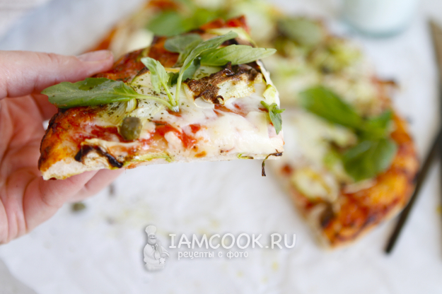 Для украшения я использовала каперсы и листочки зеленого базилика. Но это совсем не обязательно. Поверьте, аромат стоит такой, что не до украшений. Хочется непременно попробовать пиццу с кабачком на вкус.