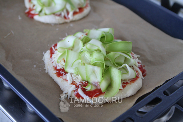 Я выпекала пиццу с кабачком (цукини) 10 минут при 250 градусах.