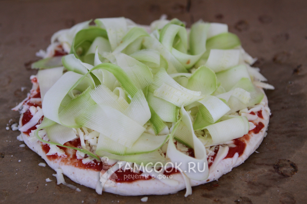 Кабачки и цукини из-за своей излишней водянистости могут испортить пиццу. Если их нарезать крупно и выложить на тесто, то даже при самой высокой температуре в духовке за 10 минут они не смогут хорошо поджариться, именно до золотистой корочки. Мало того, тесто может быть готово, а кабачки - нет, и есть пиццу с водянистыми кабачками как-то не очень хочется. Поэтому я нарезала кабачки на тонкие слайсы. Удобно это сделать ножом для чистки овощей. Выкладываем сверху слайсы из кабачков, но не солим. Соль даст излишнюю влагу. Если захочется подсолить кусочки пиццы, лучше это сделать после.