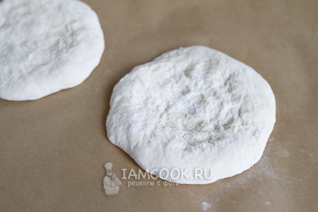 Тесто очень мягкое, воздушное, слегка прилипает к рукам. Для удобства я сразу переложила две заготовки на лист пергамента. Руки присыпала мукой. Быстрыми движениями от центра к краю начала растягивать тесто, формируя бортики у заготовок. Диаметр заготовок у меня получился примерно по 20 см.