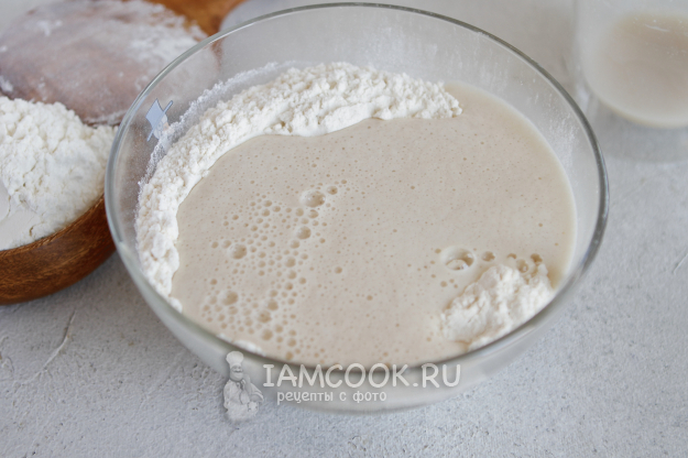 В воде развести дрожжи с сахаром. Минут через 15 влить опару в миску с мукой.